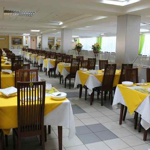 Пятиразовое питание разрабатывается ежедневно с учетом диет П, Д, Б, В. Заказное меню позволяет отдыхающим выбрать самый подходящий вариант.